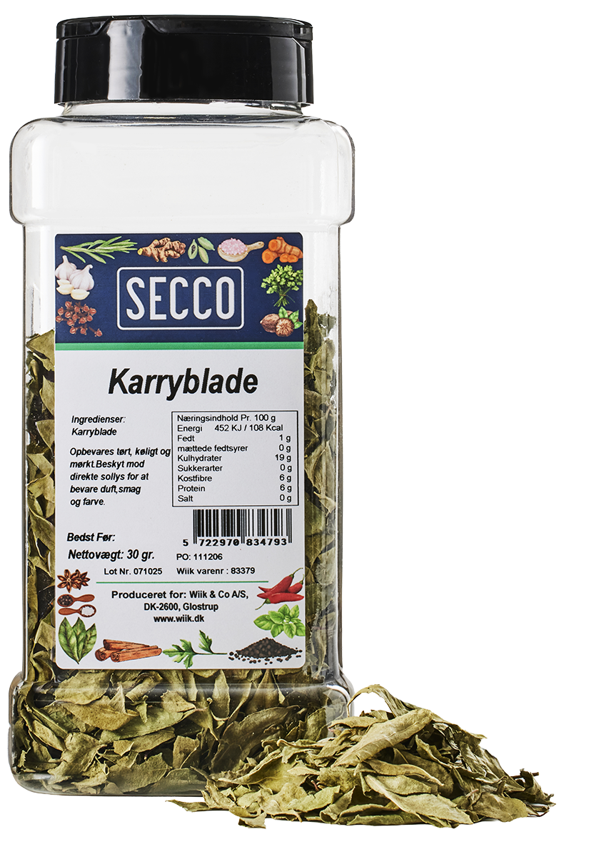 30g KarrybladeVaredeklaration: Varenummer: 83379 Handelsnavn: Karryblade Secco 12x30g Salgbare enhed: Bøtte Mærkning: N/A Brand: Secco Kvalitet: Karryblade Oprindelsesland: Indien Antal dages holdbarhed : 1080 Opbevaring: Opbevares tørt, køligt og mørkt. Beskyt mod direkte sollys for at bevare duft, smag og farve. Nettoindhold: 30g Nettovægt i gram: 30 Drænet vægt i gram: 30 EAN -kode (13) kolli: 5722970834298 EAN -kode (13) mindste: 5722970834793 Antal basisenheder per kolli: 12 Antal kolli på en EUR-palle: 48 Pallelag: 8 Kolli per Pallelag: 6