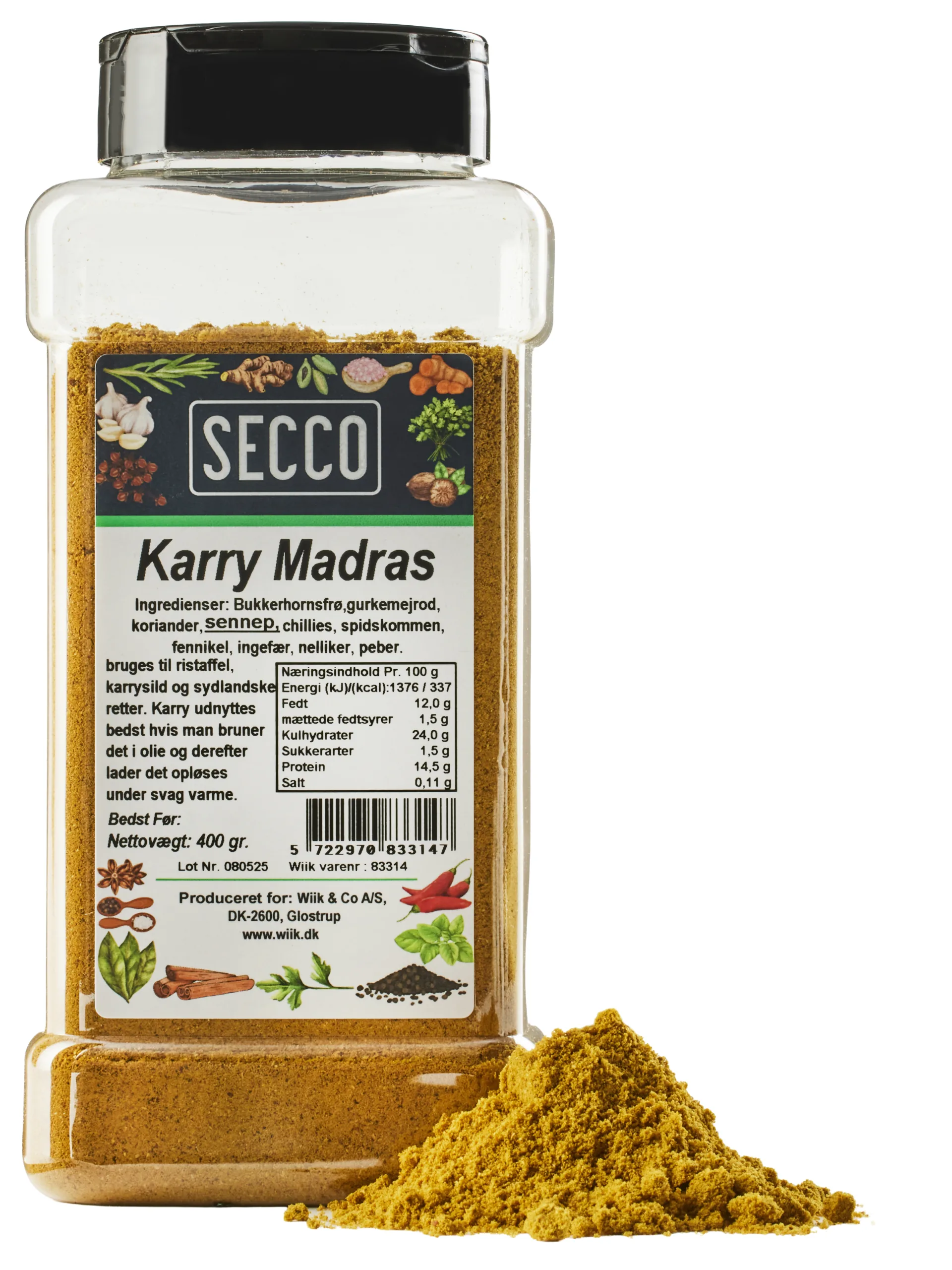 400g Karry MadrasVaredeklaration: Varenummer: 83314 Handelsnavn: Karry Madras Secco 12x400g Salgbare enhed: Bøtte Mærkning: N/A Brand: Secco Kvalitet: Karry Madras Oprindelsesland: Indien Antal dages holdbarhed : 1080 Opbevaring: Opbevares tørt, køligt og mørkt. Beskyt mod direkte sollys for at bevare duft, smag og farve. Nettoindhold: 400g Nettovægt i gram: 400 Drænet vægt i gram: 400 EAN -kode (13) kolli: 05722970833642 EAN -kode (13) mindste: 05722970833147 Antal basisenheder per kolli: 12 Antal kolli på en EUR-palle: 48 Pallelag: 8 Kolli per Pallelag: 6