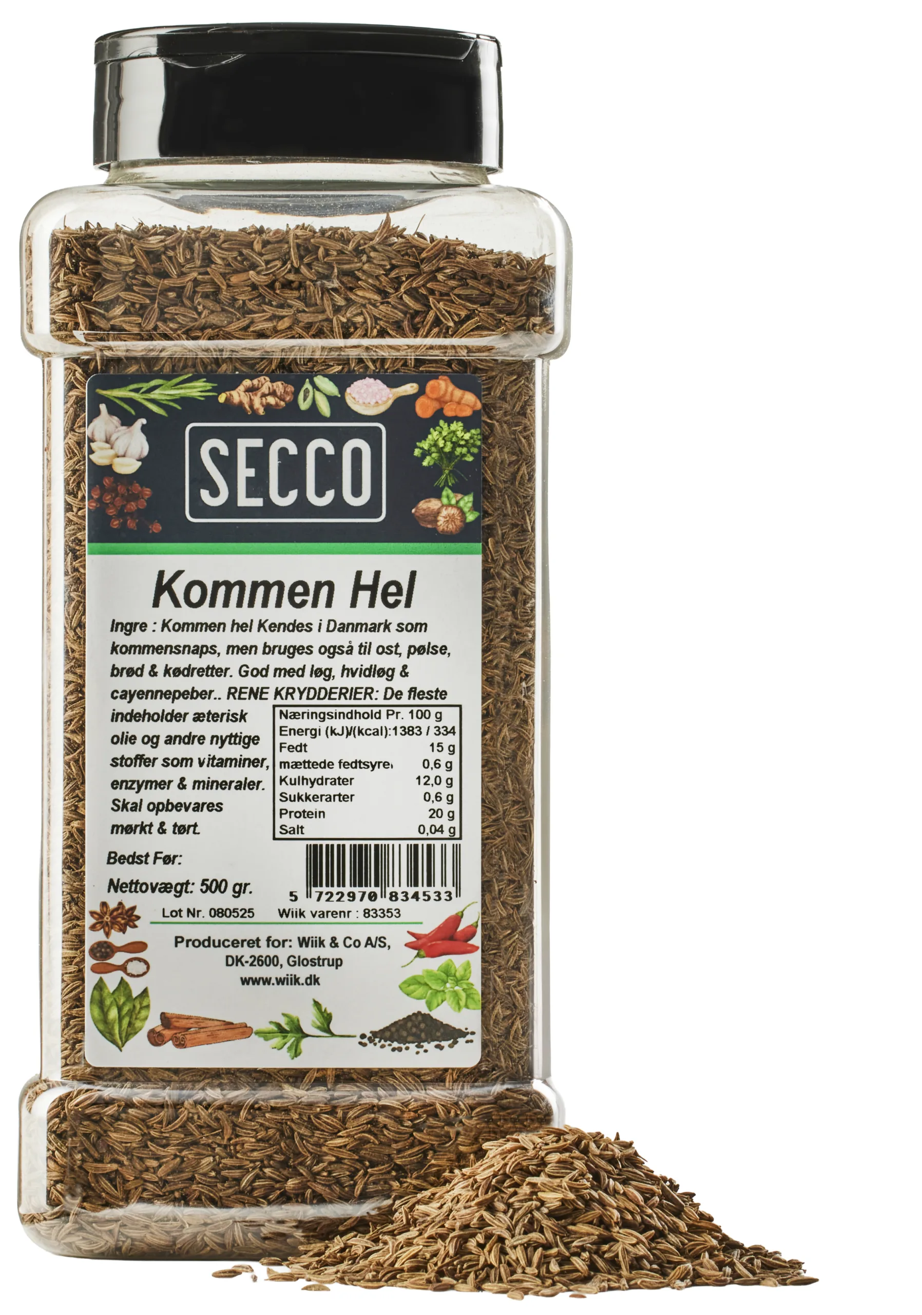 500g Kommen helVaredeklaration: Varenummer: 83353 Handelsnavn: Kommen hel Secco 12x500g Salgbare enhed: Bøtte Mærkning: N/A Brand: Secco Kvalitet: Kommen hel Oprindelsesland: Tyrkiet / Indien / syrien Antal dages holdbarhed : 1080 Opbevaring: Opbevares tørt, køligt og mørkt. Beskyt mod direkte sollys for at bevare duft, smag og farve. Nettoindhold: 500g Nettovægt i gram: 500 Drænet vægt i gram: 500 EAN -kode (13) kolli: 05722970834038 EAN -kode (13) mindste: 05722970834533 Antal basisenheder per kolli: 12 Antal kolli på en EUR-palle: 48 Pallelag: 8 Kolli per Pallelag: 6