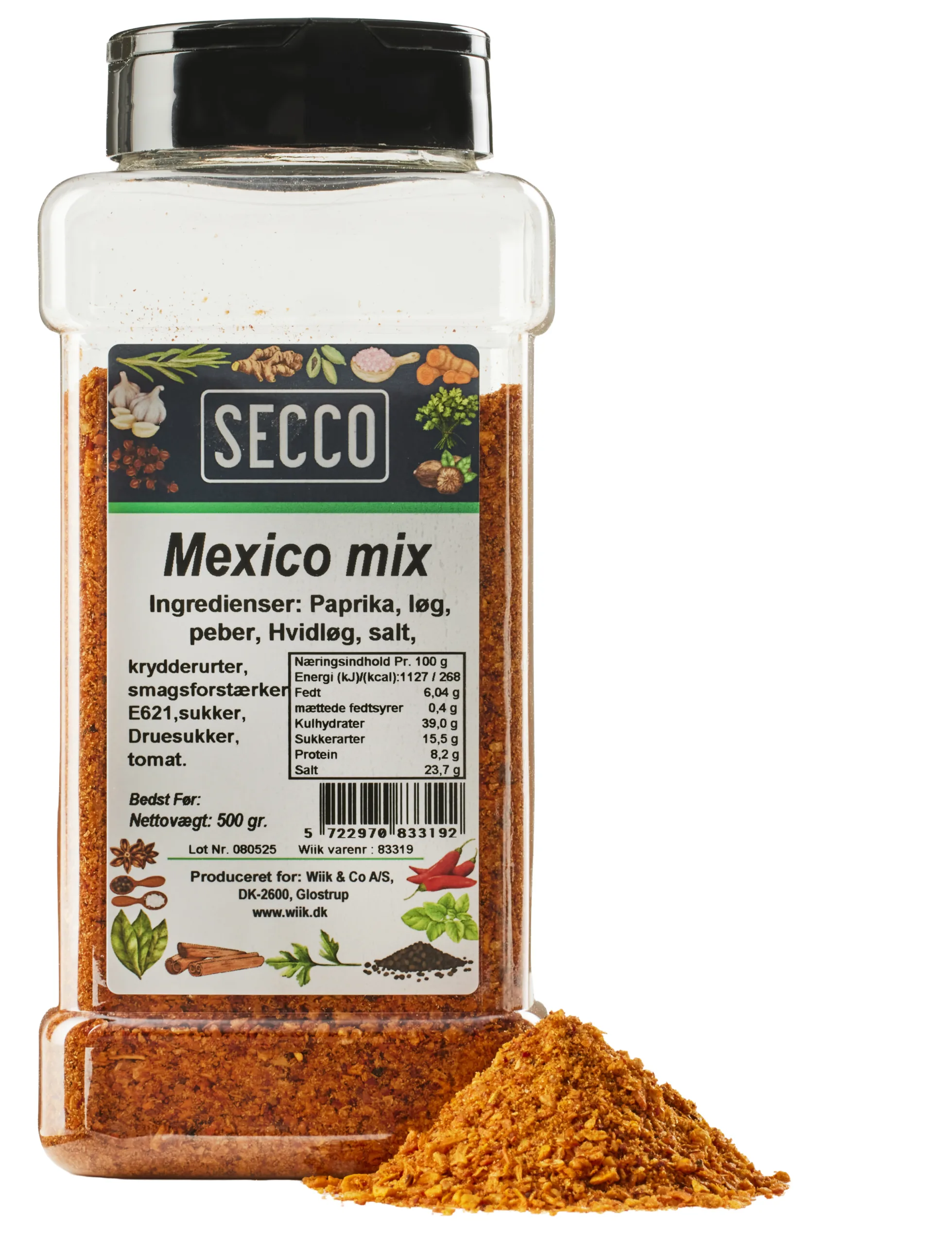 500g Mexico mixVaredeklaration: Varenummer: 83319 Handelsnavn: Mexico mix Secco 12x500g Salgbare enhed: Bøtte Mærkning: N/A Brand: Secco Kvalitet: Mexico mix Oprindelsesland: Mix I Danmark Antal dages holdbarhed : 1080 Opbevaring: Opbevares tørt, køligt og mørkt. Beskyt mod direkte sollys for at bevare duft, smag og farve. Nettoindhold: g Nettovægt i gram: 500 Drænet vægt i gram: 500 EAN -kode (13) kolli: 05722970833697 EAN -kode (13) mindste: 05722970833192 Antal basisenheder per kolli: 12 Antal kolli på en EUR-palle: 48 Pallelag: 8 Kolli per Pallelag: 6