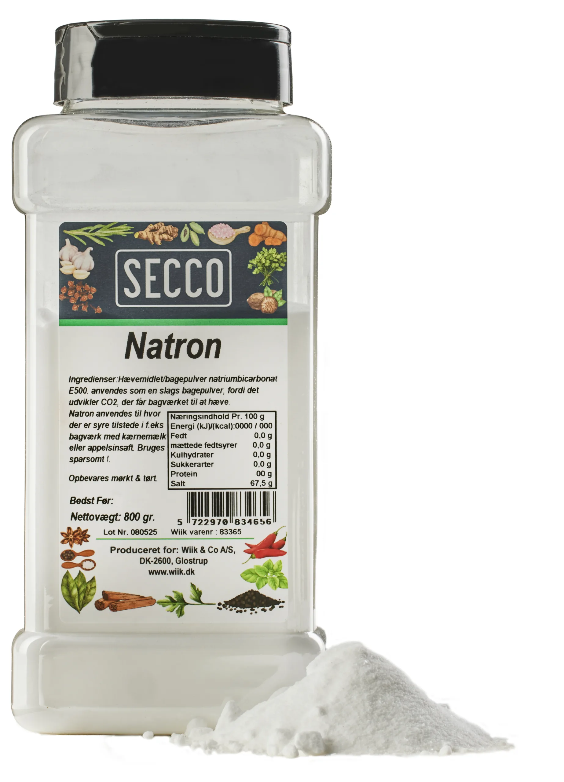 800g NatronVaredeklaration: Varenummer: 83365 Handelsnavn: Natron Secco 12x800g Salgbare enhed: Bøtte Mærkning: N/A Brand: Secco Kvalitet: Natron Oprindelsesland: Tyskland Antal dages holdbarhed : 1080 Opbevaring: Opbevares tørt, køligt og mørkt. Beskyt mod direkte sollys for at bevare duft, smag og farve. Nettoindhold: 800g Nettovægt i gram: 800 Drænet vægt i gram: 800 EAN -kode (13) kolli: 05722970834151 EAN -kode (13) mindste: 05722970834656 Antal basisenheder per kolli: 12 Antal kolli på en EUR-palle: 48 Pallelag: 8 Kolli per Pallelag: 6