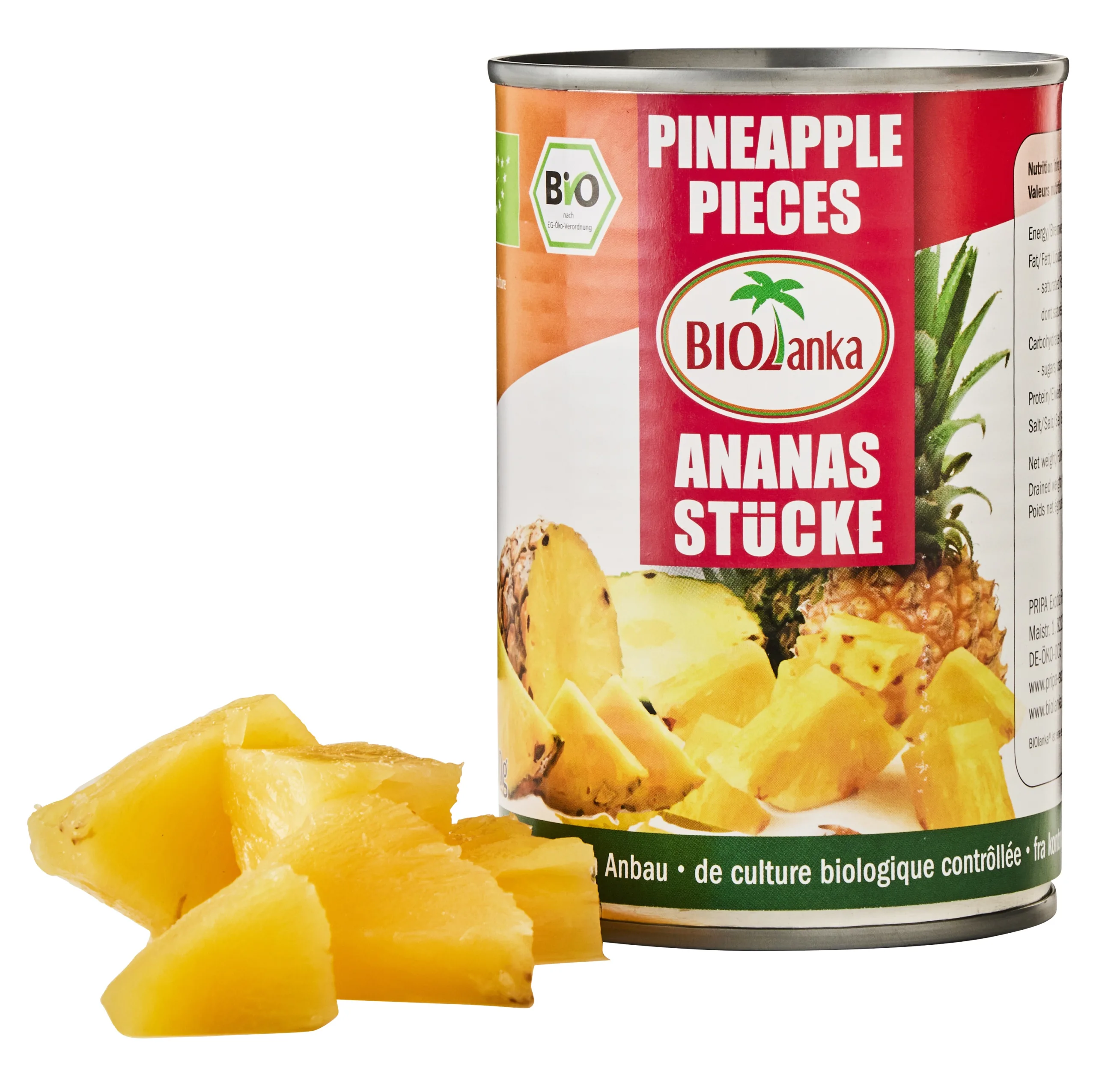 400g Økologiske ananasstykker i juiceVaredeklaration: Varenummer: 92051 Handelsnavn: Ananas øko stykker i juice Biolanka 6x400g Salgbare enhed: Dåse Mærkning: N/A Brand: Biolanka Kvalitet: Håndskrællet, økologisk og moden ananas. Oprindelsesland: Sri Lanka Antal dages holdbarhed : 720 Opbevaring: Uåbnet: Tørt ved stuetemperatur. Åbnet: I køleskab (+5°C) i lufttæt beholder. Nettoindhold: 400g Nettovægt i gram: 400 Drænet vægt i gram: 240 EAN -kode (13) kolli: 04260190650317 EAN -kode (13) mindste: 04260190651314 Antal basisenheder per kolli: N/A Antal kolli på en EUR-palle: N/A Pallelag: 10 Kolli per Pallelag: 24