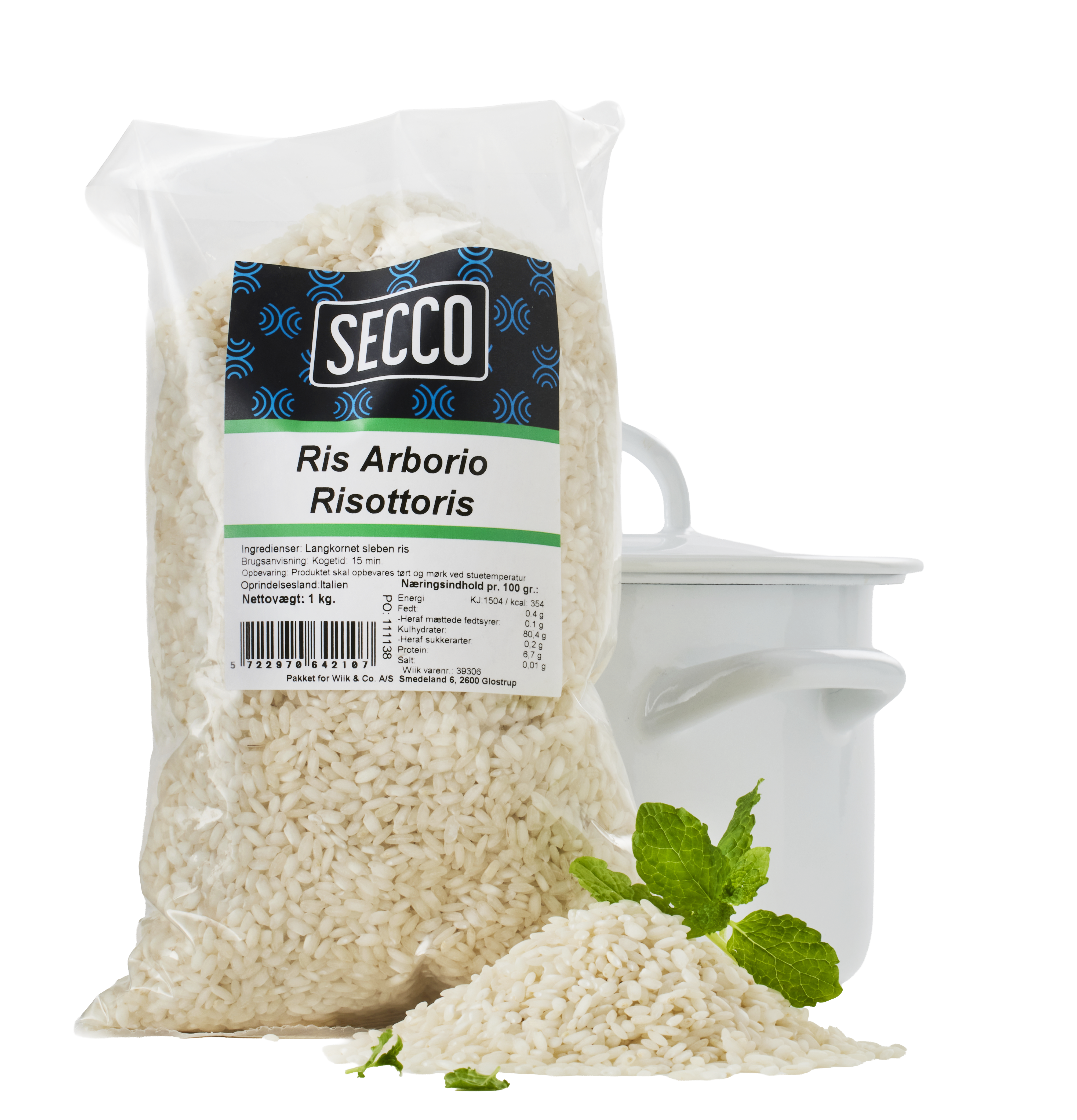 1kg Risottoris arborioVaredeklaration: Varenummer: 39306 Handelsnavn: Risottoris arborio Secco 12x1kg Salgbare enhed: Pose (BAG) Mærkning: N/A Brand: Secco Kvalitet: Langkornede arborio risottoris. Oprindelsesland: Italien Antal dages holdbarhed : 730 Opbevaring: Uåbnet: Tørt ved stuetemperatur. Åbnet: I lufttæt beholder. Nettoindhold: 1000g Nettovægt i gram: 1000 Drænet vægt i gram: 1000 EAN -kode (13) kolli: 5722970642114 EAN -kode (13) mindste: 5722970642107 Antal basisenheder per kolli: 12 Antal kolli på en EUR-palle: 48 Pallelag: 6 Kolli per Pallelag: 8