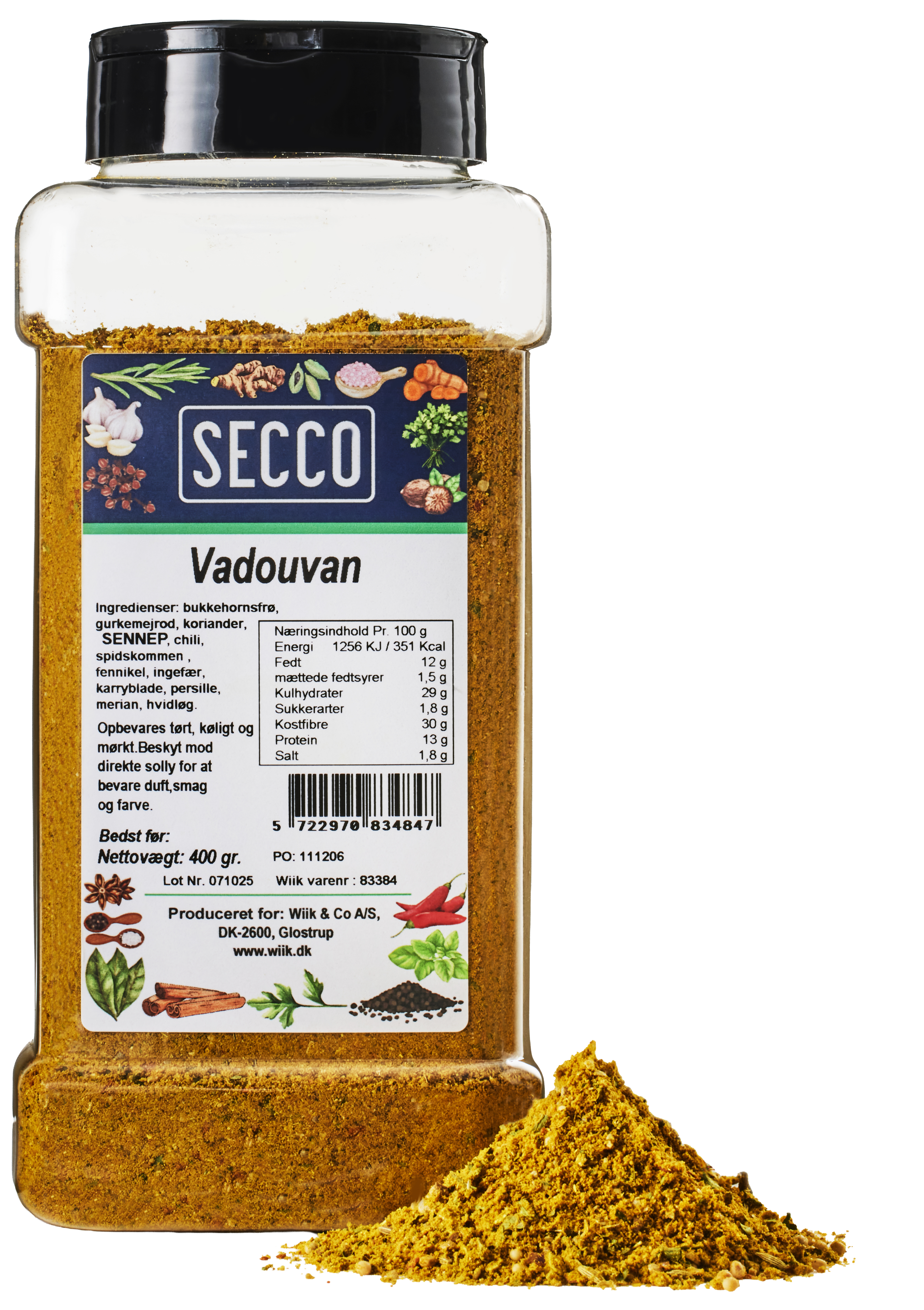 400g VadouvanVaredeklaration: Varenummer: 83384 Handelsnavn: Vadouvan Secco 12x400g Salgbare enhed: Bøtte Mærkning: N/A Brand: Secco Kvalitet: Vadouvan Oprindelsesland: Indien Antal dages holdbarhed : 1080 Opbevaring: Opbevares tørt, køligt og mørkt. Beskyt mod direkte sollys for at bevare duft, smag og farve. Nettoindhold: 400g Nettovægt i gram: 400 Drænet vægt i gram: 400 EAN -kode (13) kolli: 5722970834342 EAN -kode (13) mindste: 5722970834847 Antal basisenheder per kolli: 12 Antal kolli på en EUR-palle: 48 Pallelag: 8 Kolli per Pallelag: 6
